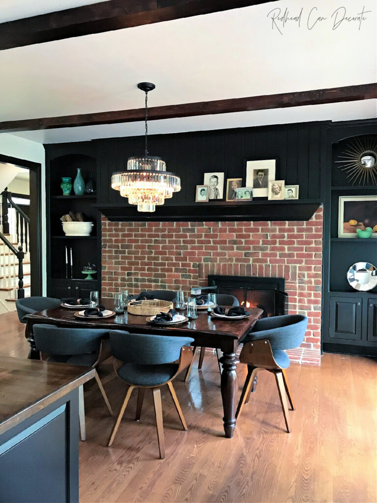 The photo above was taken during the tour we took before we bought the house. I wanted to show you the open window wall that leads from a small dining area into a built-in office or command station (if you want to call it that). I don’t have little kiddos anymore, so I am calling it an office for redheadcandecorate.com and using it for my craft storage, personal bills, and you know all the things we all have to keep organized when we own a home. I thought it was a unique space just off the kitchen (pantry is to the left, too). Somehow, the opening in the wall seemed more like a place people would line up and give me their credit card to pay for their colonoscopy 😆. It took me a few weeks to decide to ask Rick if he knew how to cover that big daddy up. He did.