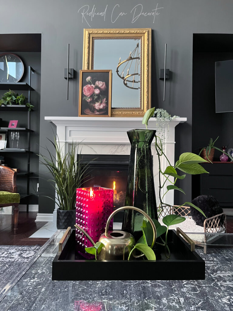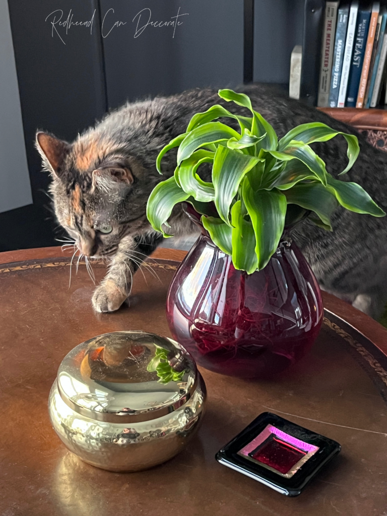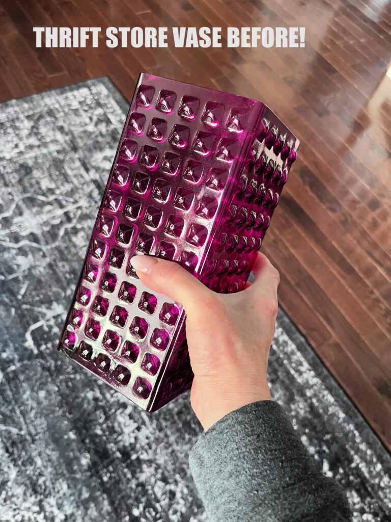 Isn’t that thrift store purple vase pretty all lit up 🔥? Thrift store colored glass vases are absolutely ideal for candle holders, or hurricanes (kitty protectors, too)). We recently bought a new sofa (reveal is next) and I needed to choose an accent color in our family room to go with greys and greens. I chose cool pinks and purples. Just look how pretty this old vase looks now! I found the scentless non-drip pillar candle at HomeGoods in clearance and the large green glass vase to the right is actually from Kohl’s cash I had (yippee).