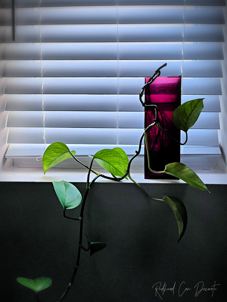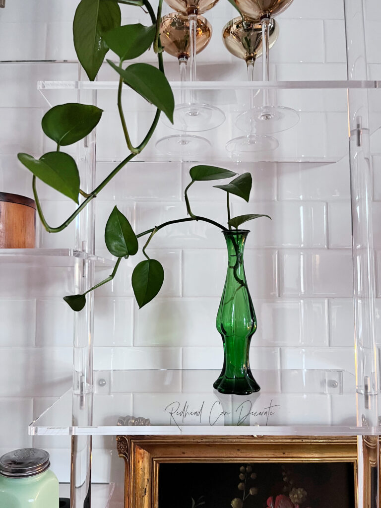 Notice I took the green glass a different route…I added a real plant clipping from my huge Pathos plant. I have literally done this trick all over the house and here’s proof with a little “Pathos parade” using just clippings off the plant, water, and of course the thrift store vase…